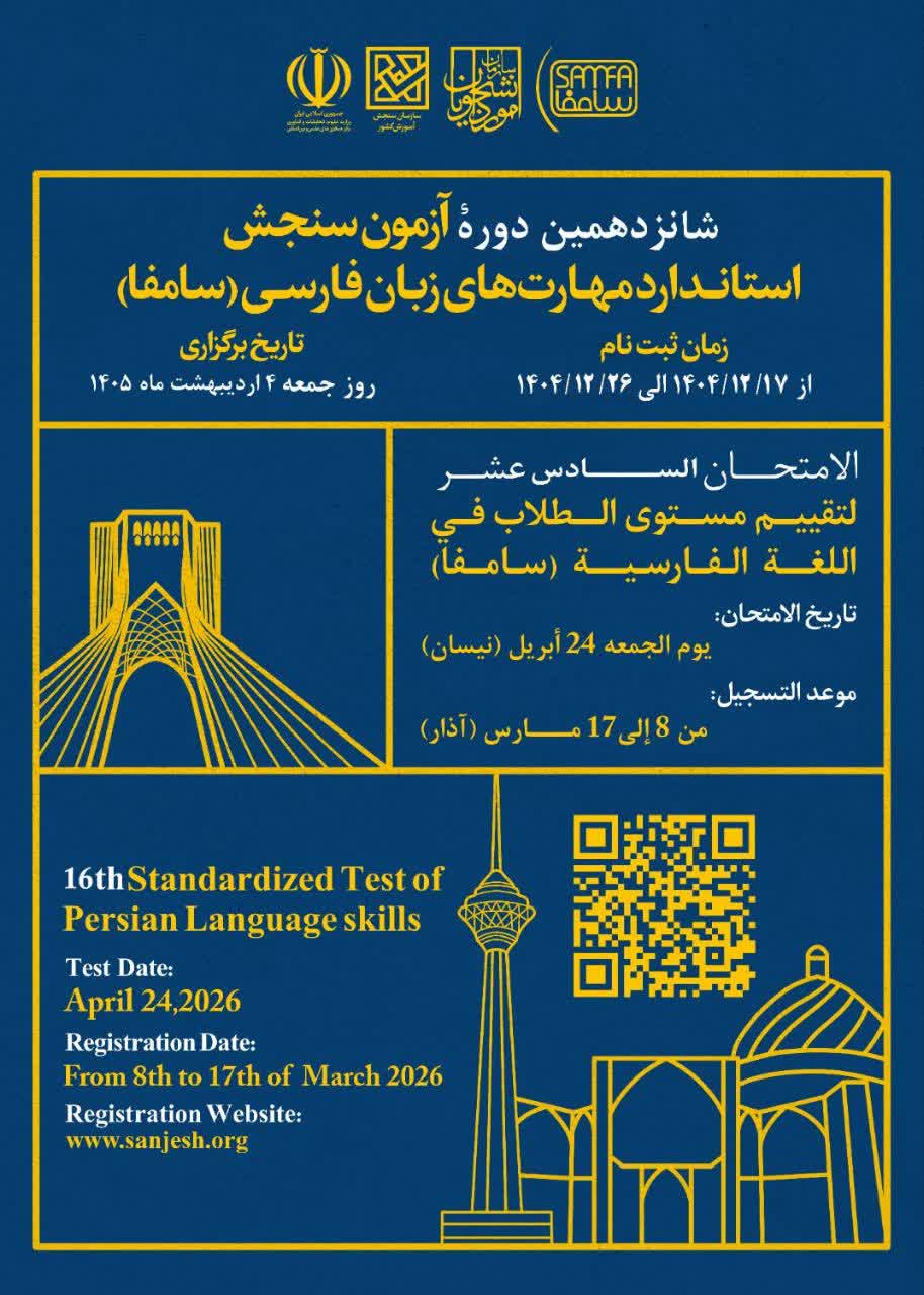 شانزدهمین دوره آزمون سنجش استاندارد مهارت های زبان فارسی (سامفا) ، روز جمعه 4 اردیبهشت 1405 مطابق با 24 آوریل 2026 میلادی برگزار خواهد شد.