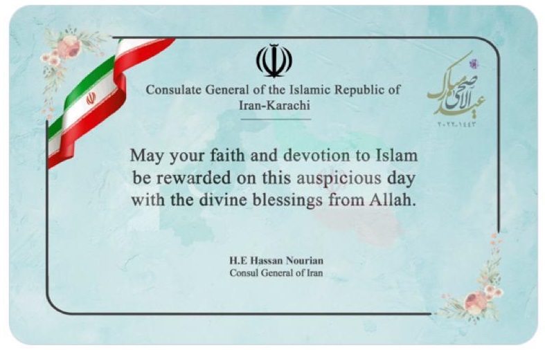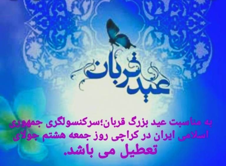 سرکنسول گری جمهوری اسلامی ایران در کراچی ضمن تبریک عید خجسته قربان به همه مسلمانان پاکستان بویژه هموطنان گرامی مقیم این کشور، به اطلاع میرساند، این سرکنسولگری در روز جمعه 8 جولای تعطیل است.