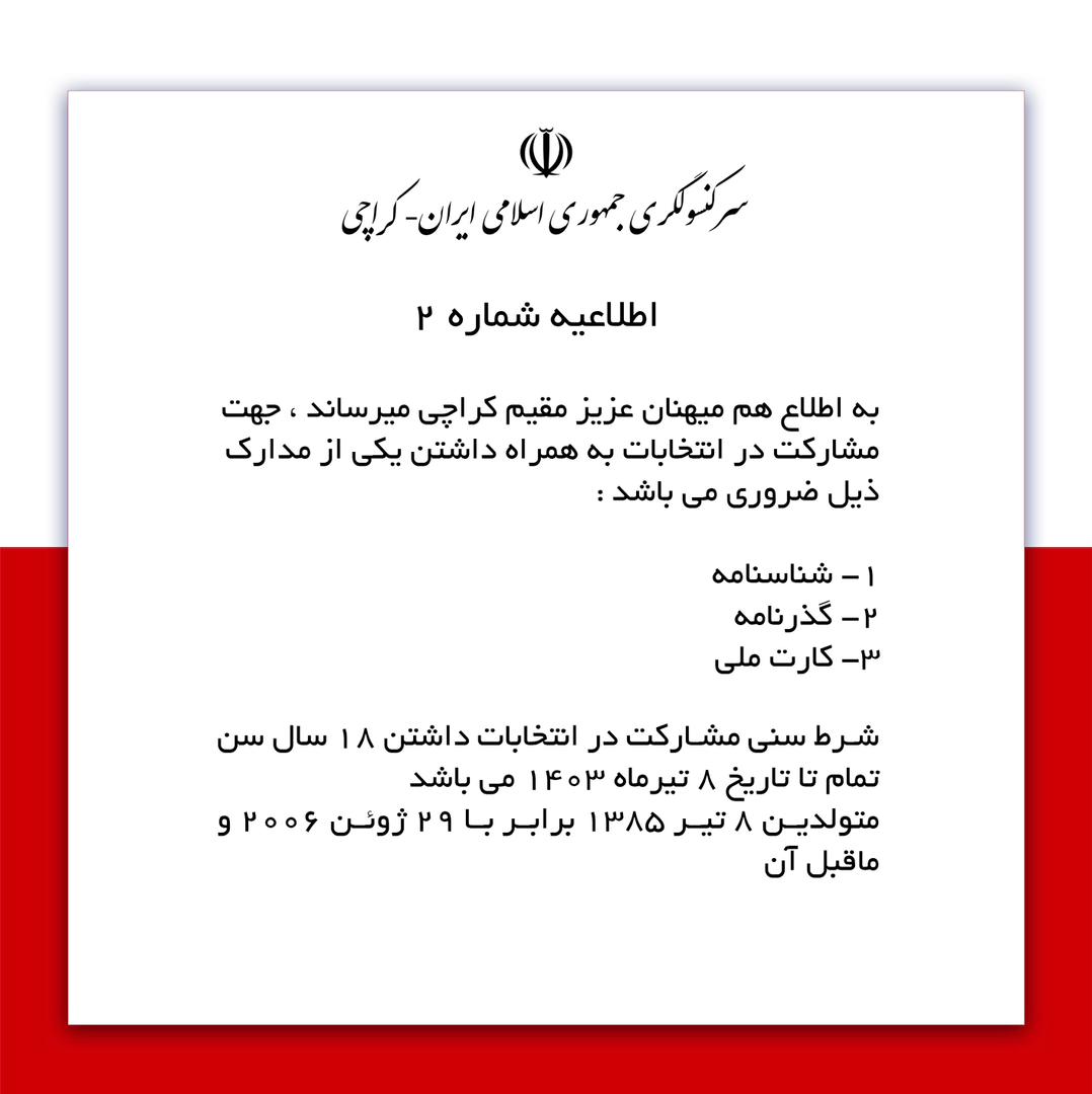 به اطلاع هممیهنان عزیز مقیم کراچی میرساند، جهت مشارکت در انتخابات به همراه داشتن یکی از مدارک ذیل ضروری میباشد: