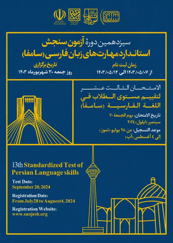 سیزدهمین دوره آزمون سنجش استاندار مهارت های زبان فارسی (سامفا) ، در روز جمعه 30 شهریور 1403 مطابق با 20 سپتامبر 2024 برگزار خواهد شد.