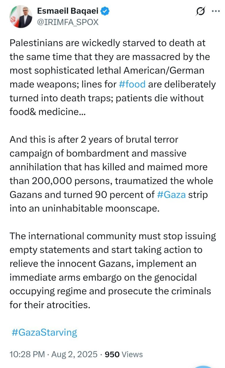 پیام سخنگوی وزارت امور خارجه در شبکه ایکس راجع به ضرورت اقدام فوری برای کمکرسانی به غزه و توقف نسلکشی