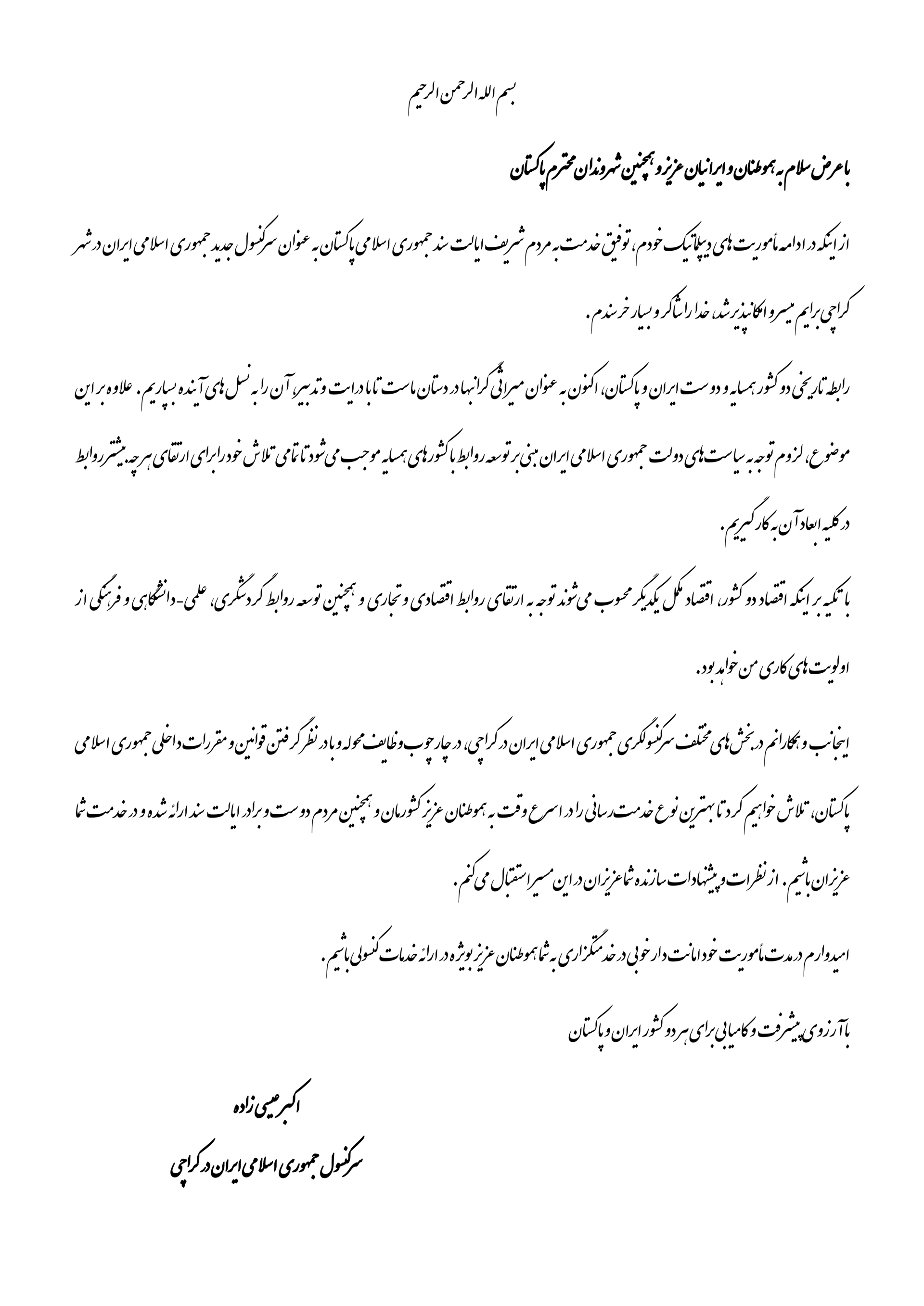 از اینکه در ادامه مأموریتهای دیپلماتیک خودم، توفیق خدمت به مردم شریف ایالت سند جمهوری اسلامیپاکستان به عنوان سرکنسول جدید جمهوری اسلامی ایران در شهر کراچی برایم میسر و امکانپذیر شد، خدا را شاکر و بسیار خرسندم.