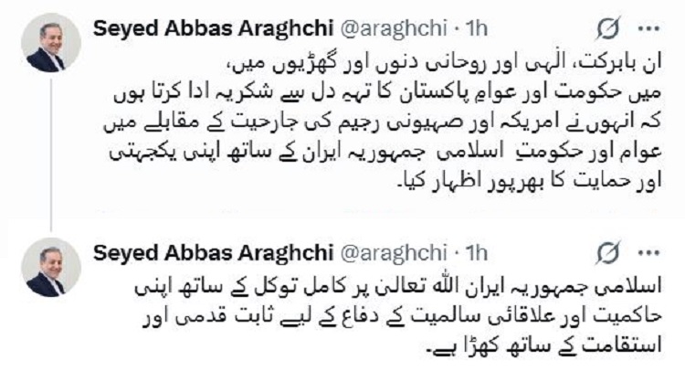 سید عباس عراقچی وزیر امور خارجه در پیامی‌به زبان اردو در شبکه ایکس، نوشت: