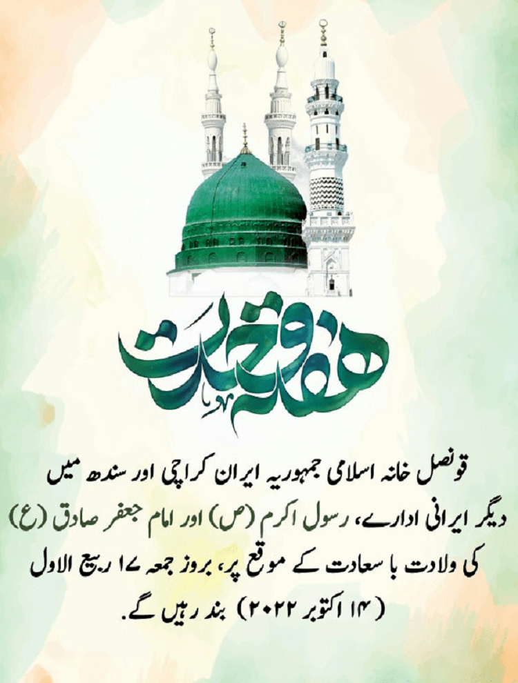قونصل خانہ اسلامی جمہوریہ ایران کراچی اور سندھ میں دیگر ایرانی ادارے، رسول اکرم(ص) اور امام جعفر صادق(ع) کی ولادت با سعادت کے موقع پر، بروز جمعہ ۱۷ ربیع­الاول (14 اکتوبر 2022)  بند رہیں گے.